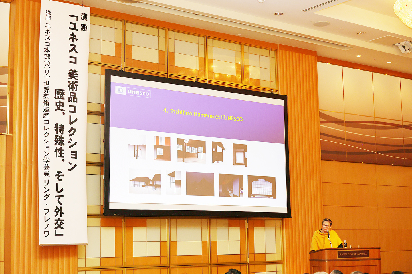 ユネスコが戦後文化財保護のために果たしてきた役割、同機関が所蔵する美術作品の紹介に加え、後世に遺すべき作品として、本年ユネスコ世界芸術遺産に認定された濱野の作品とその意義を語ってくださいました。また、濱野の作品が展示されたパリのユネスコ本部内部の様子が動画で紹介されました。この特別展示場は毎日約2,000人の方が行き来する場所で、濱野の作品が世界遺産として認定されたことをお集まり頂いたみなさんと実感することができました。