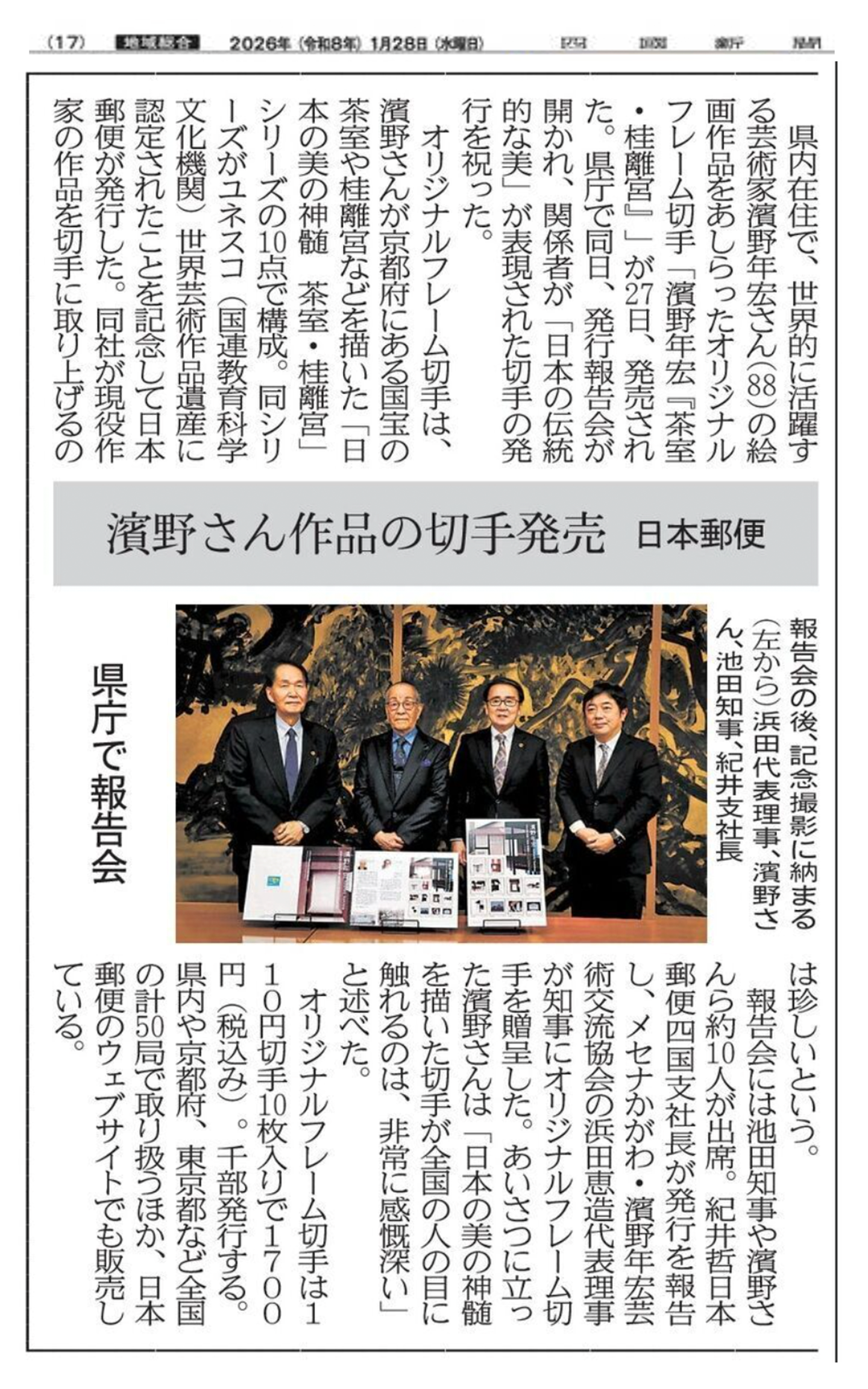 また、1月27日の発売に合わせ、香川県庁にて発行報告会が開催されました。浜田恵造代表理事が池田豊人香川県知事にオリジナルフレームを贈呈いたしました。