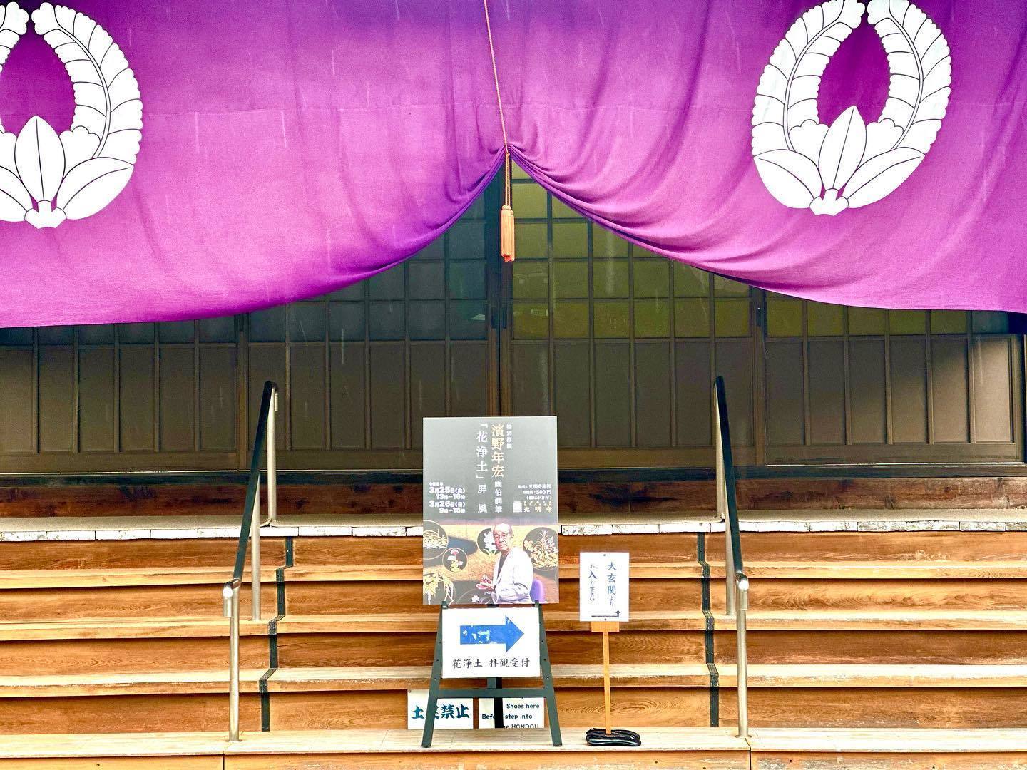 会場:光明寺(高松市飯田町)大型屏風「花浄土」を制作、光明寺(香川県高松市飯田町)に奉納した。2023年3月18日に仕上げの署名を入れ、2日間、同寺の檀家の方を中心に公開した。