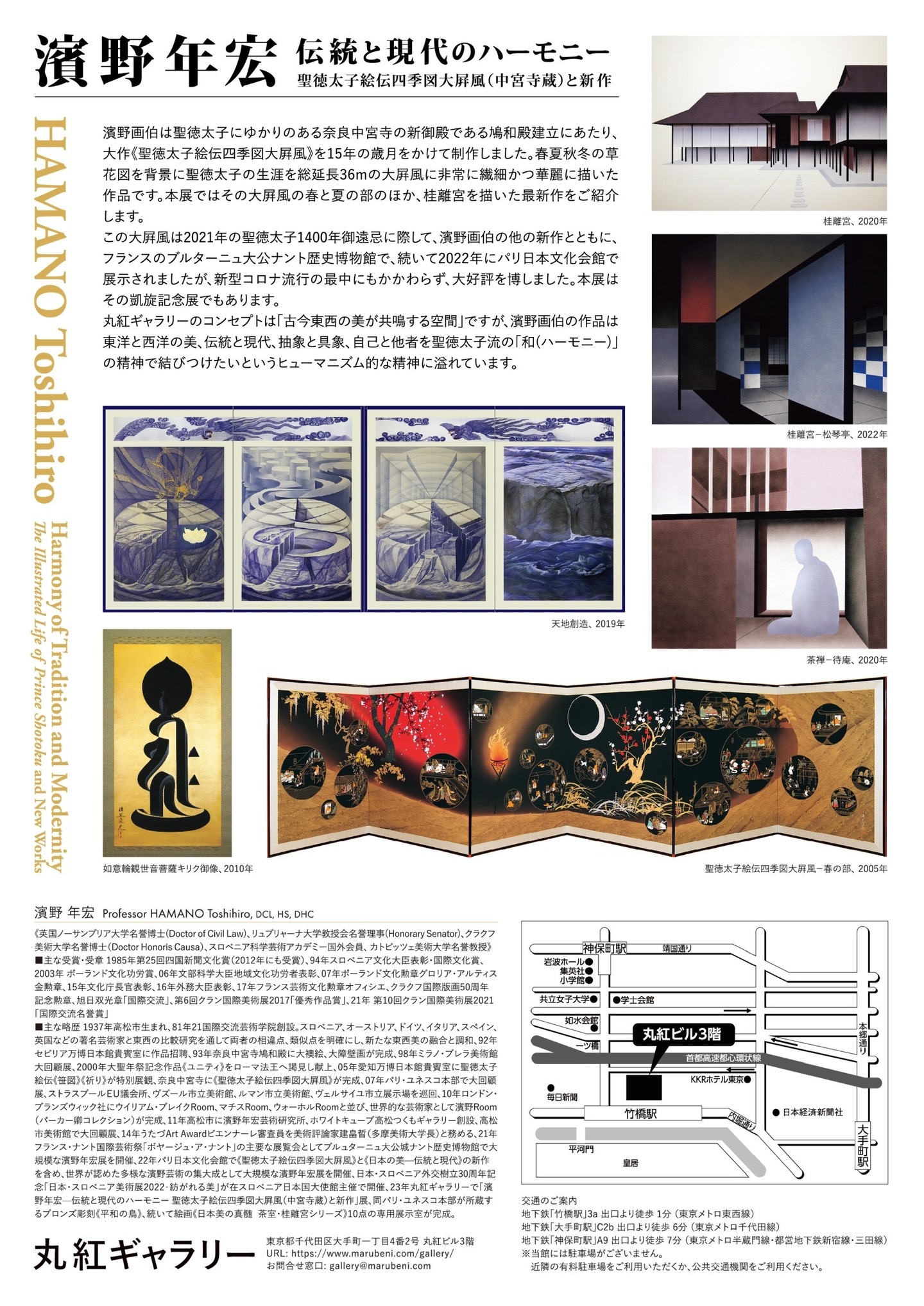 新型コロナ感染症の流行拡大、ロシアのウクライナ侵攻に伴い、私たちのこれまで の生活や価値観が大きく変化しています。文化の多様性が叫ばれながら、私たちを取 り巻く社会的環境と心がより内向きになってきました。そのような中、聖徳 太子 1400 年御遠忌にあたり、フランス芸術文化勲章受章者、濱野年宏氏の集大成ともいえる中宮寺蔵の「聖徳太子絵伝四季図大屏風」*が当館で公開されることは、日本人 の文化や美意識の原点を見つめ直し、1400 年にわたって脈々と受け継がれてきた人々 の想い、そして声を世界に向けて響かせるとともに、太子が建国の礎として説いた「和をもって貴しとなす(以和為貴)」の精神を行き詰まり感のある世界に、 発信する貴重な機会となります。多様性・多価値を認識しながら、非寛容の世界が表 れてきた現代において、「慈しみの世界観」「日本の美—伝統と現代」を表現した新作 を含め、世界が認めた多様な濱野芸術の集大成も合わせて展観します。
