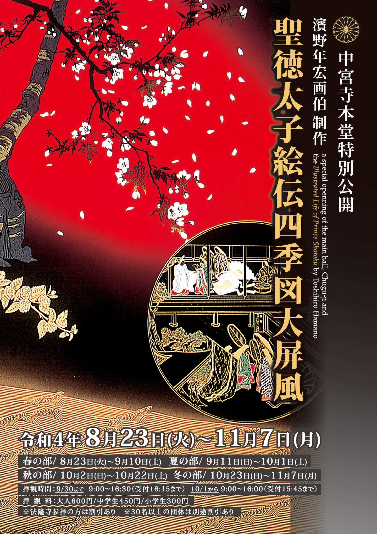 中宮寺本堂特別公開 濱野年宏画伯制作「聖徳太子絵伝四季図大屏風」(奈良 中宮寺)詳細▷