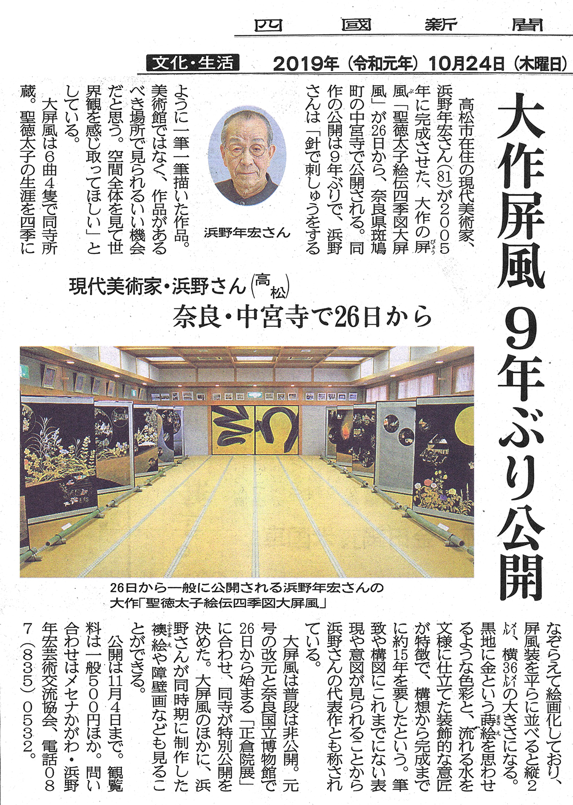 奈良中宮寺で濱野画伯制作「聖徳太子絵伝四季図大屏風」が令和改元記念として特別公開されました。