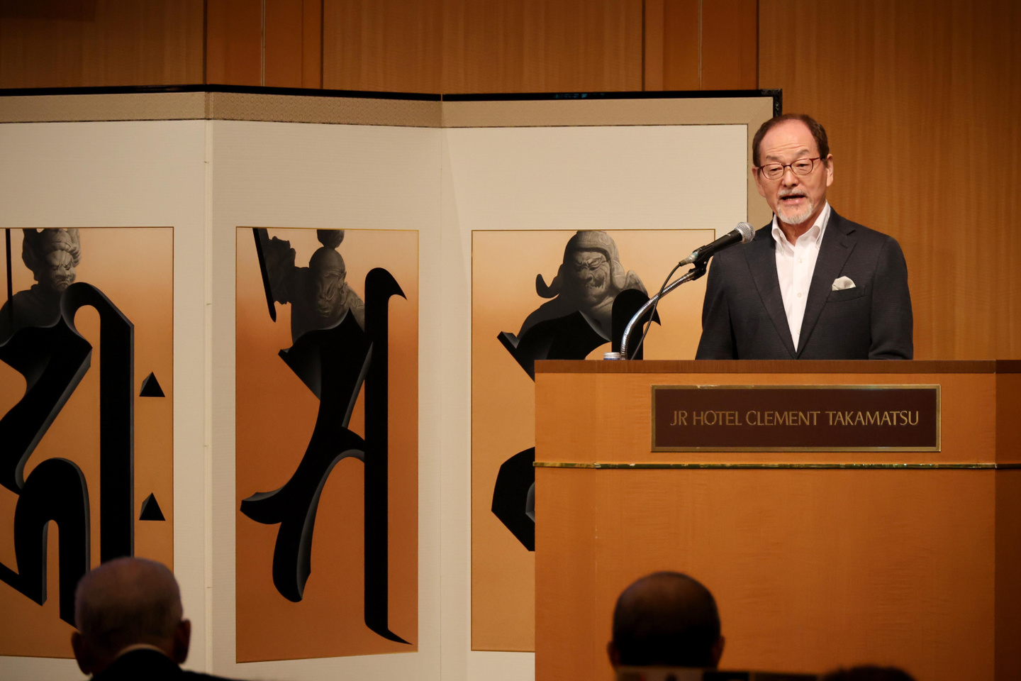 当財団主催「文化の集い」が開催され、約160名の方がお集まりくださいました。今年は、奈良国立博物館井上洋一館長をお迎えし、「日本の美術の源流」について、大阪・関西万博万博出品の濱野の三代傑作の考察を交えて語っていただきました。また会場には、万博初公開となった新作十二神将屏風も特別展示され、香川で初めてのお披露目の機会となりました。