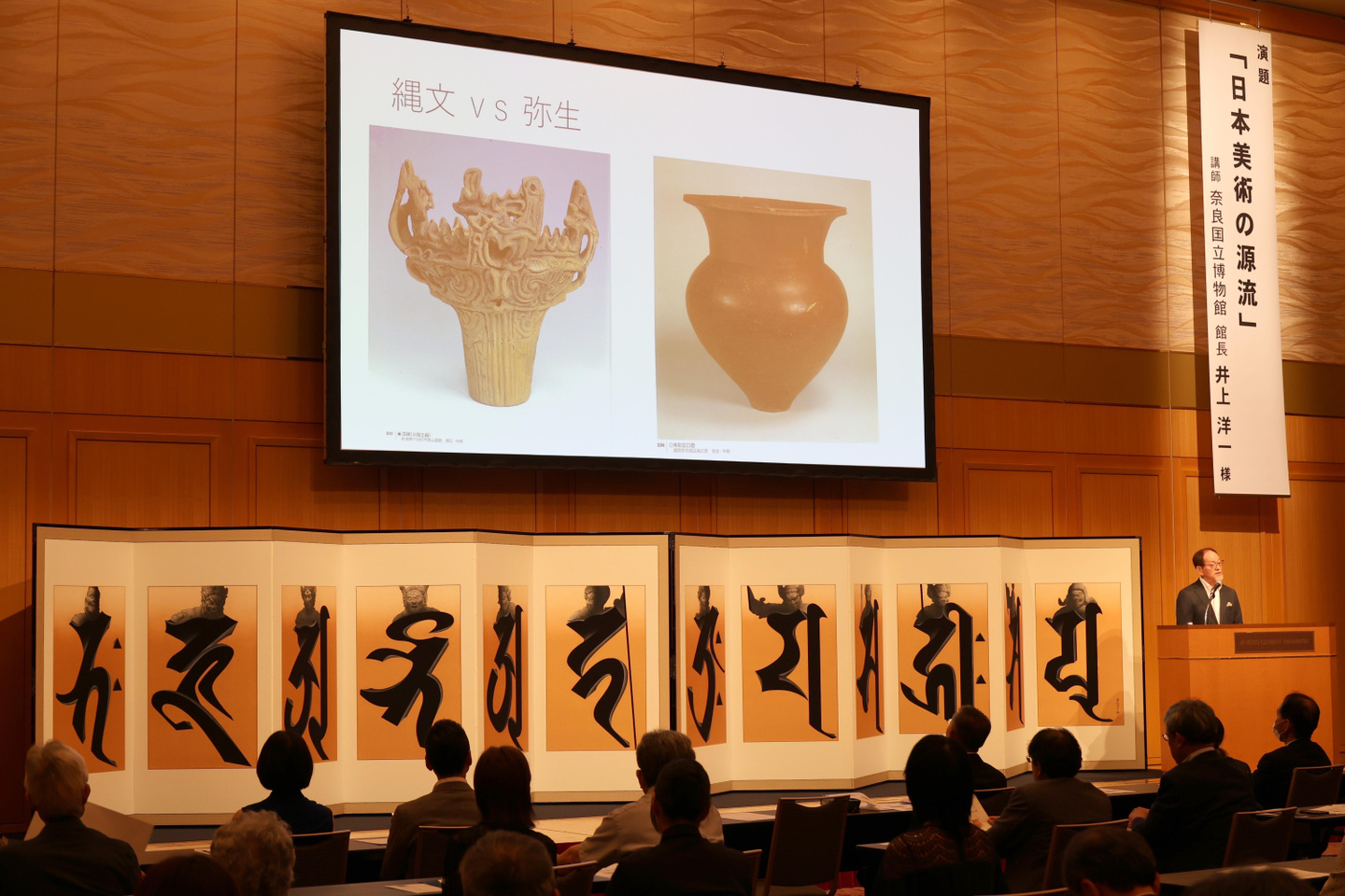 井上館長は、日本列島は四季に恵まれ、これまできわめて個性豊な造形芸術を生み出してきたと考察され、造形的な「縄文」と絵画的な「弥生」文化の価値の相違とその変遷に「日本美術の源流」を見ることができ、姿形を変えても美の根底には『祈り』という共通の価値があると語られました。